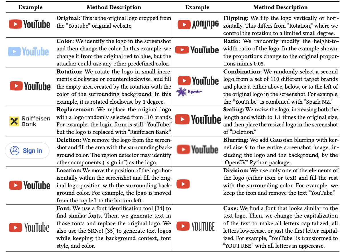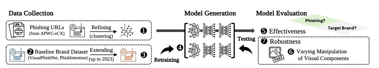 For the experiment of the phishing research, we collect a real-world phishing dataset (i.e., screenshots and HTML files) with URLs from APWG eCX at the benignning. Then, we refine the dataset by filtering out the pages that involve errors (e.g., HTTP 404) or CAPTCHA. Note that we use the APWG dataset for testing model purpose alone. Second, we prepare two additional datasets: the baseline from combining PhishIntention (Liu et al., 2022) with VisualPhishNet (Abdelnabi et al., 2020) and the extended one with more reference brand. Next, we carefully select six state-of-the-art visual similarity-based anti-phishing techniques and re-train them with these datasets. Third, we systematically evaluate the models with the APWG dataset. Lastly, we manipulate visual components (e.g., logo images) with varying transformations, assessing the robustness of the above models.